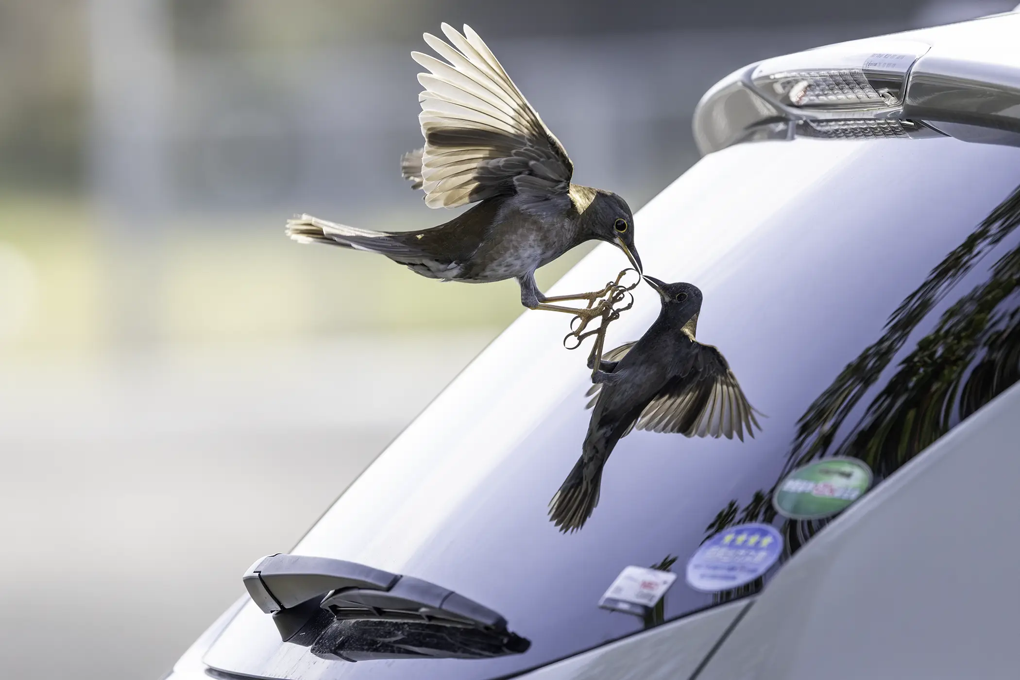 New! リアウインドウに映った自分を敵と勘違いしているのだろうか。何度も何度もガラスに映った自分に飛びかかるシロハラ 2024年12月 鹿児島県 出水市