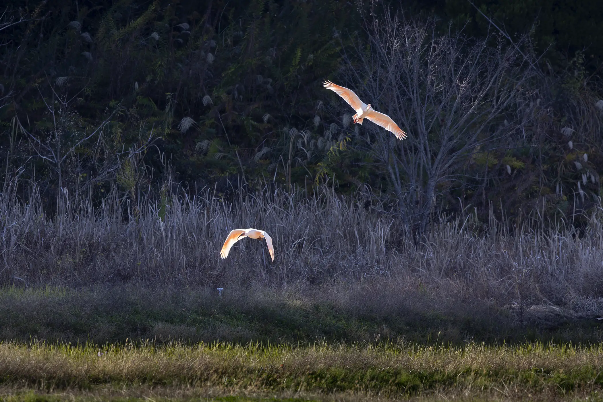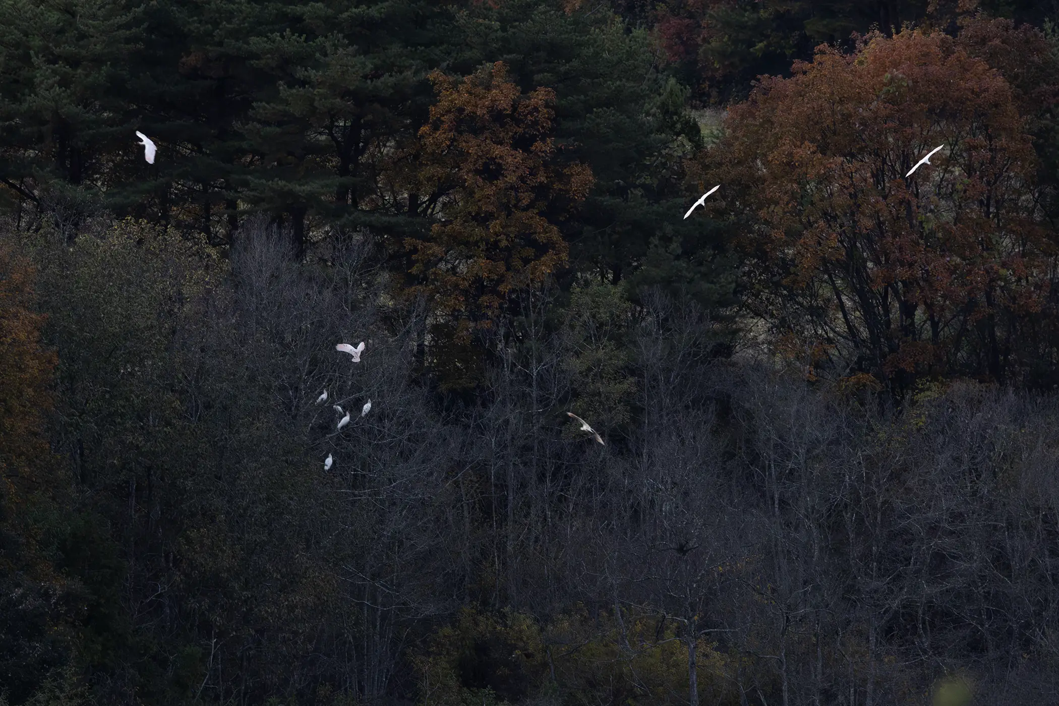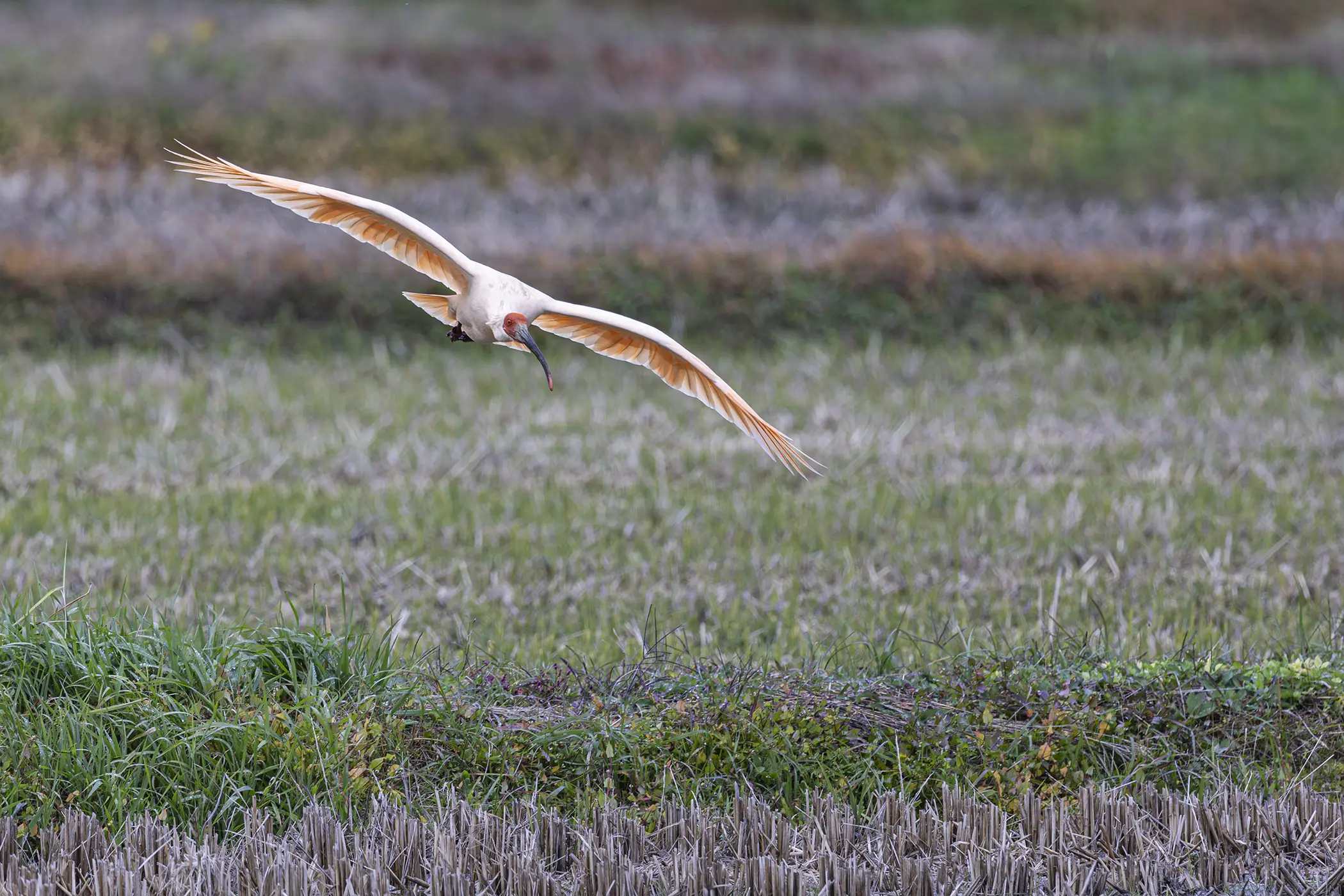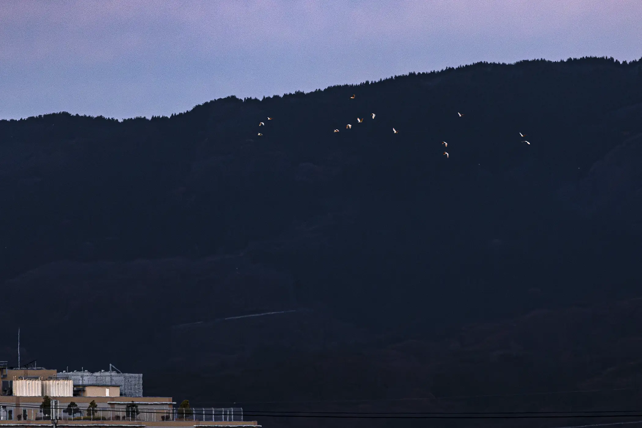 日の出とともに、ねぐらの森から飛び立ち餌場に向かうトキの群れ