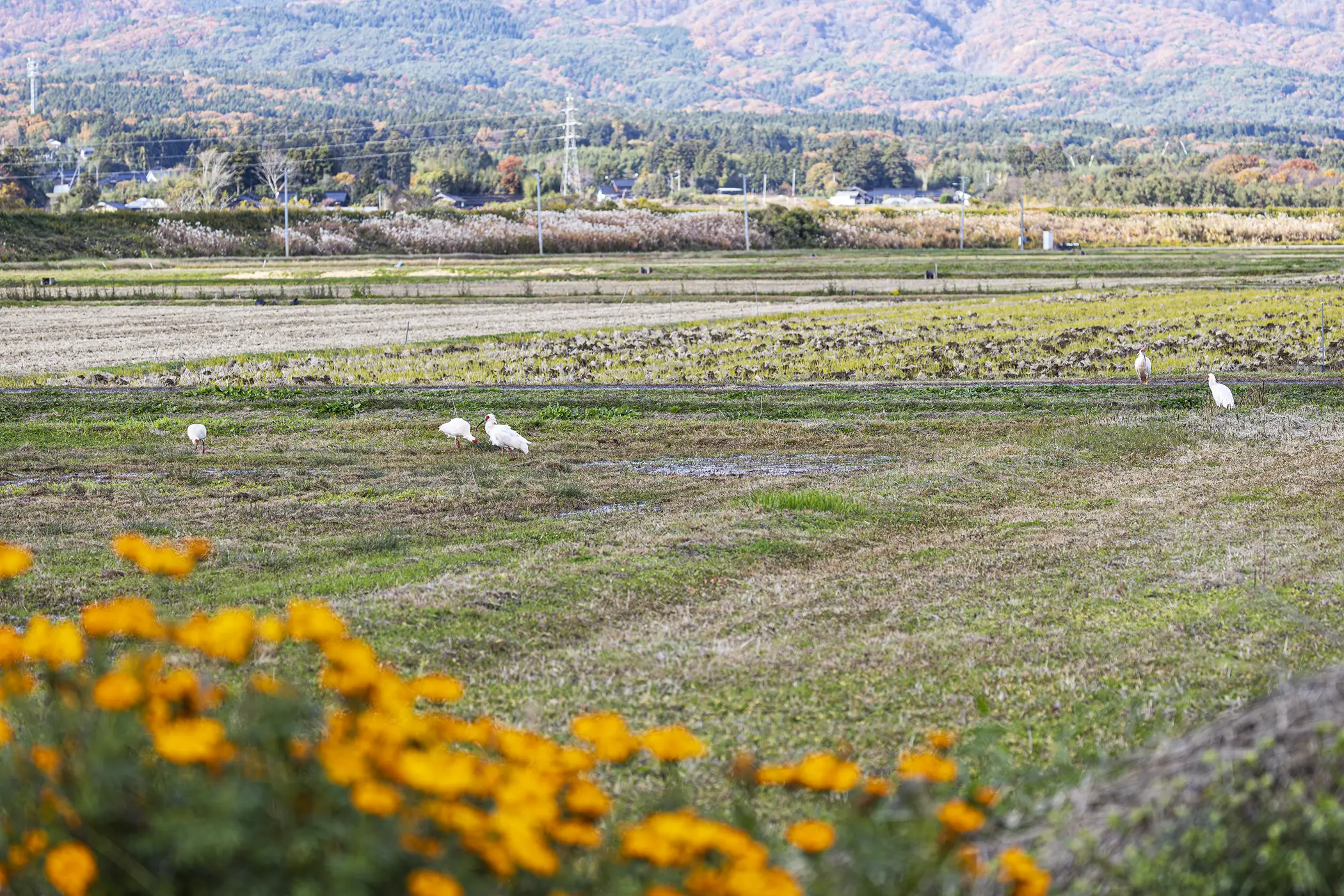 「ふゆみずたんぼ」。佐渡の人達は、冬も田んぼから水を抜かず、手を入れ水辺の生き物の生息環境を維持している。そこはトキの餌場にもなっている