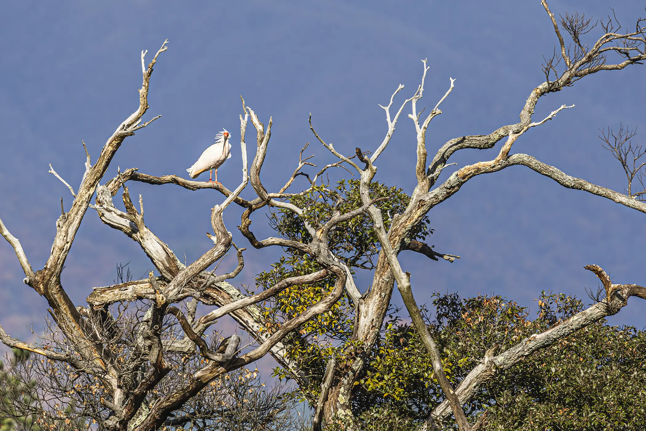 日没の時刻になると、ねぐらの枯れ木に三々五々トキ達が戻ってくる