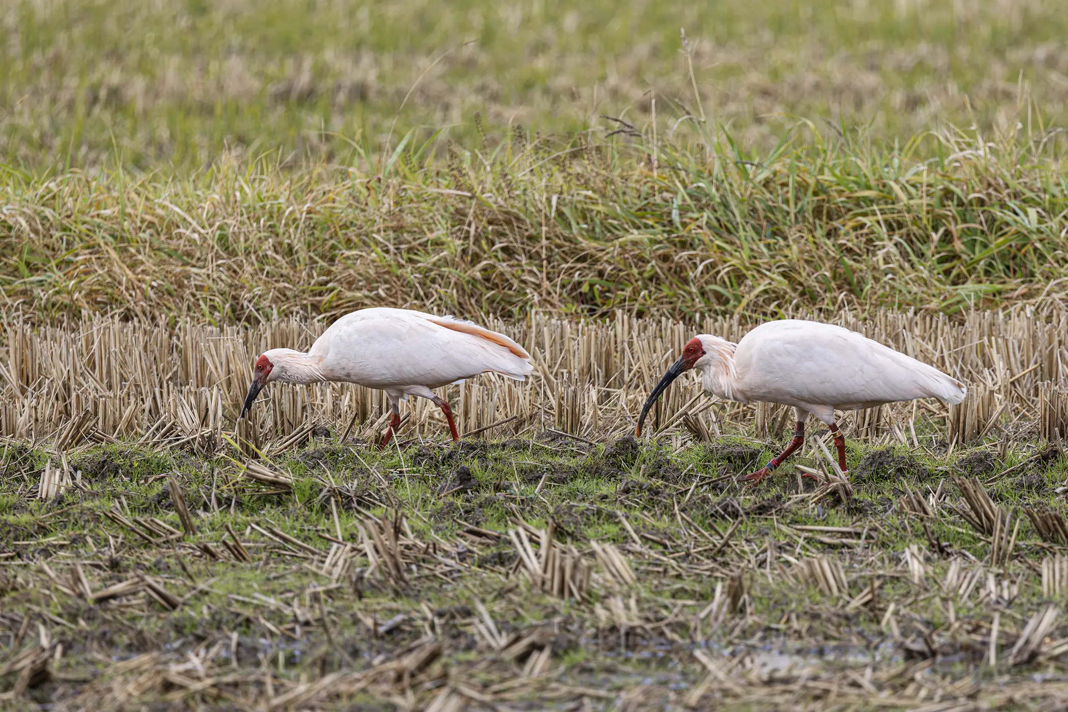 左のトキには足輪がない、野生で生まれ育ったトキだ。右は人口飼育され野生順化訓練を受け放鳥されたトキ
