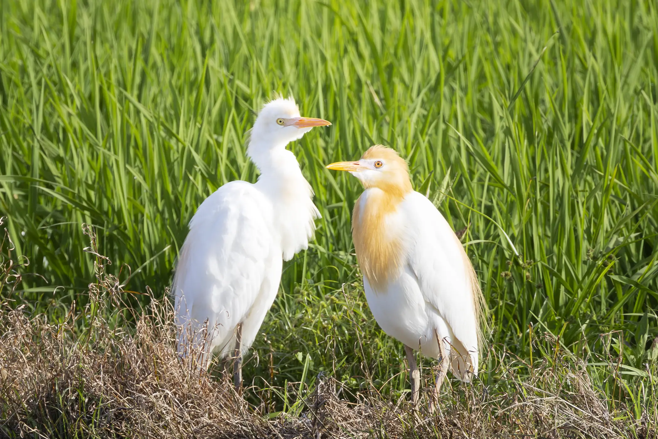 群れから少し離れたところにいるいい感じの2羽のアマサギ 2024年5月 沖縄県 金武町