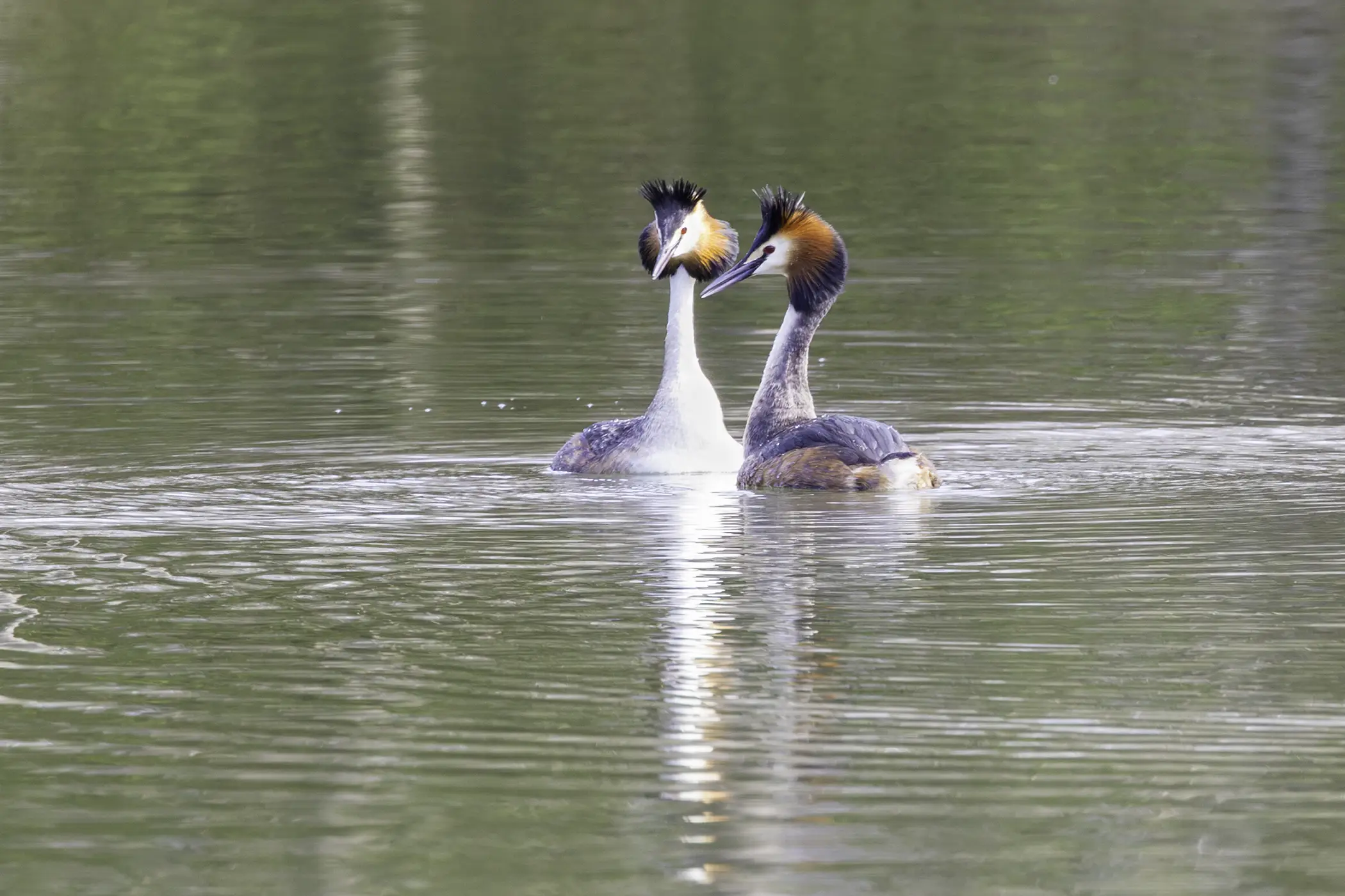 New! 相手を見失わない程度の距離で、別々に池に潜りエサを探していたカンムリカイツブリ。時折近づいては見つめ合って愛を囁き合う 2024年11月 栃木県 奥日光