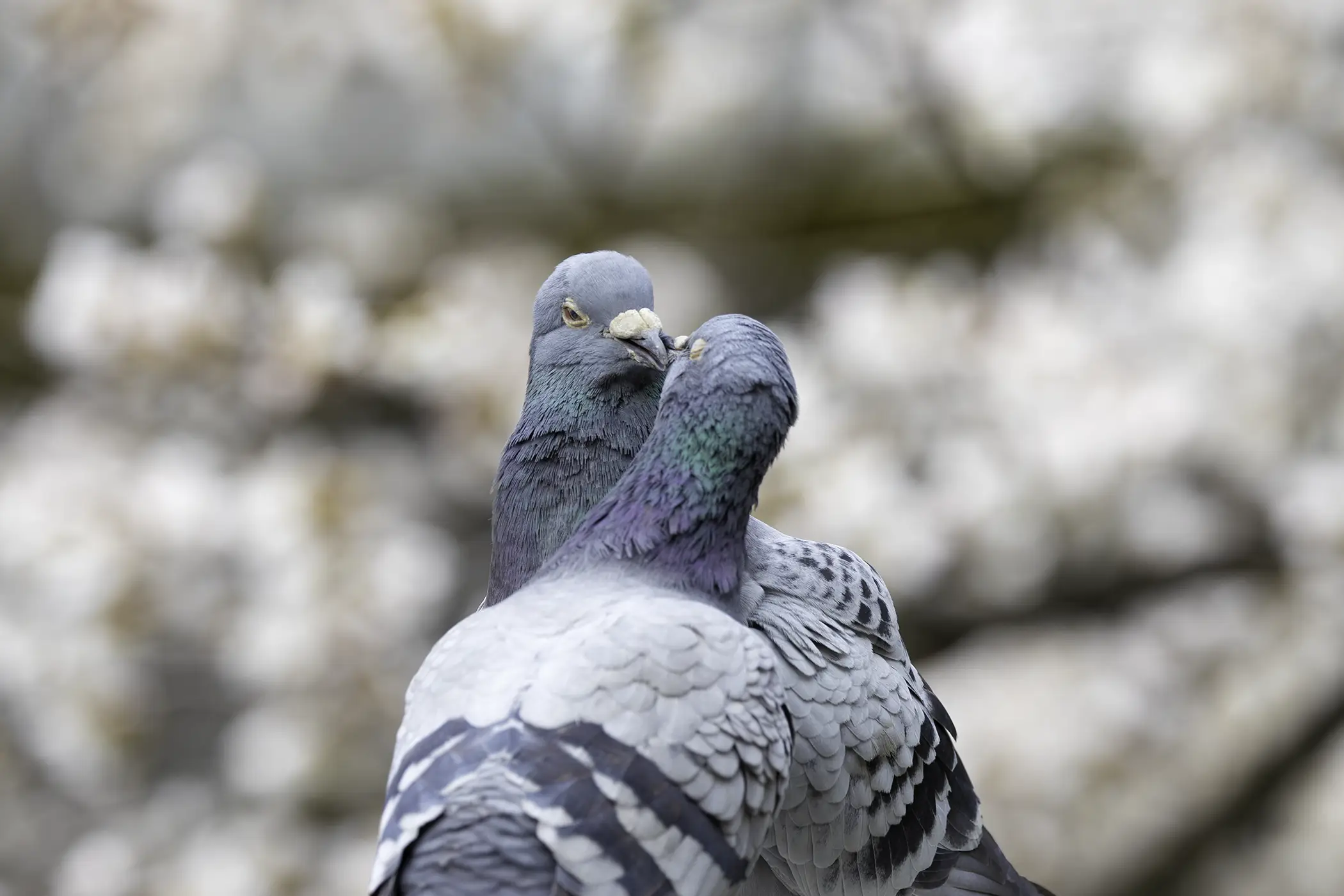 New! 満開のソメイヨシノの公園でピッタリと寄り添うハトのカップル。チューして、とリクエストしてみたら応えてくれた!(目をつぶっている方が♀) 2025年3月 東京都文京区 江戸川公園