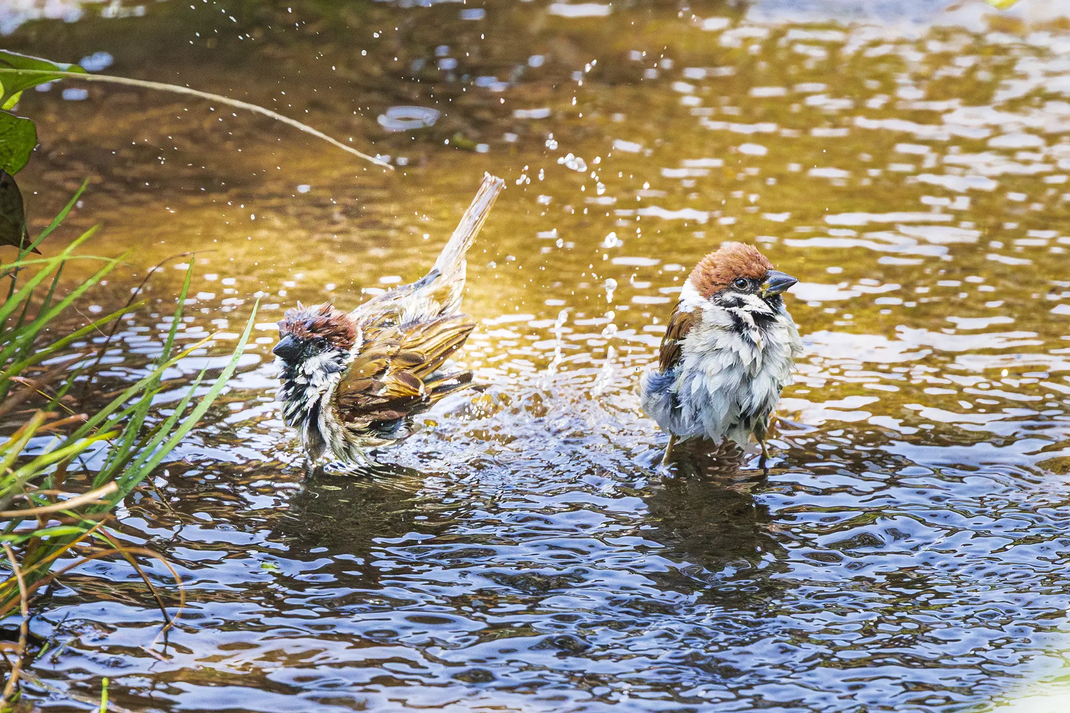 水浴びをする2羽のスズメ 2022年6月 東京都文京区 肥後細川庭園